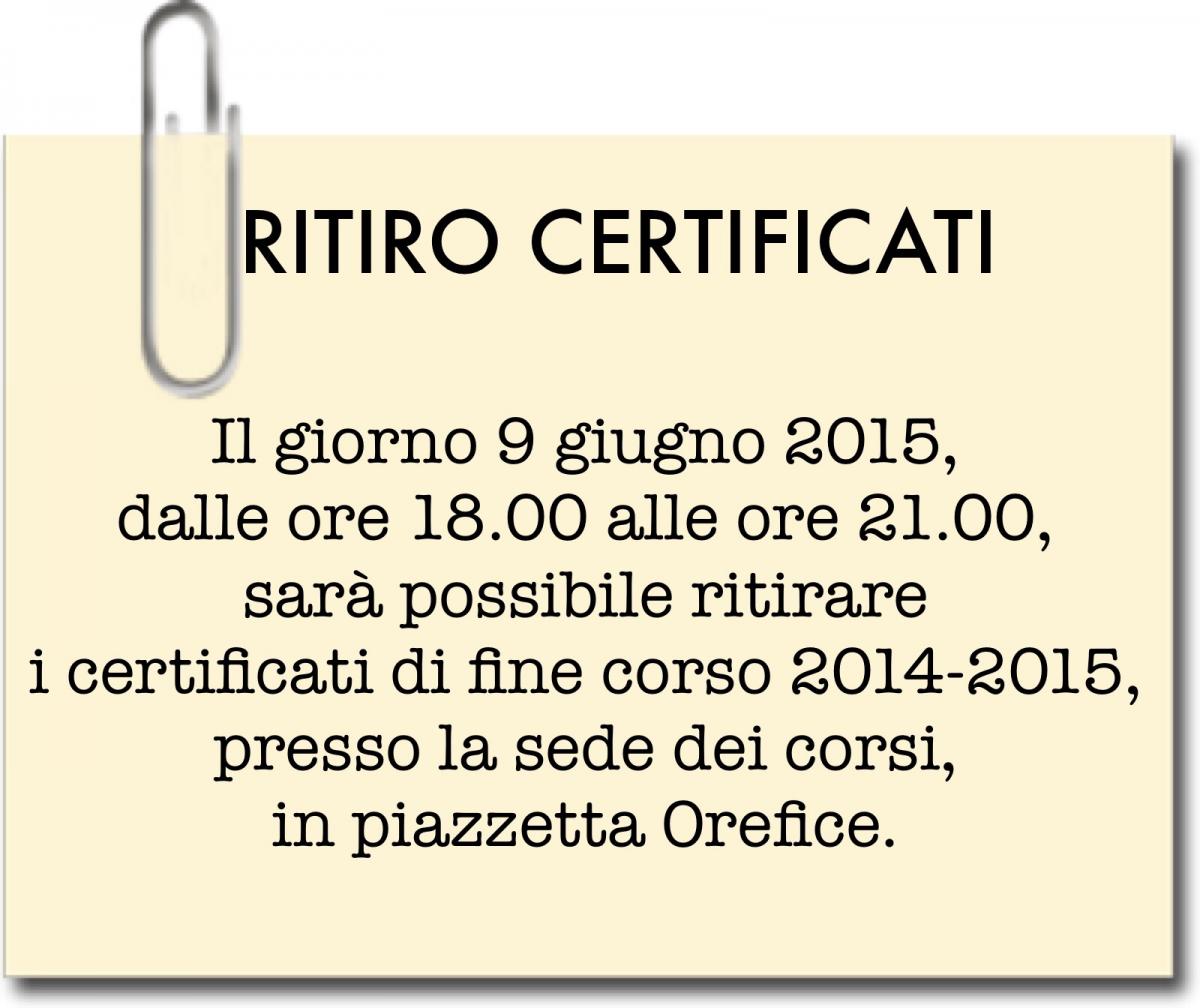 Il giorno 9 giugno 2015, dalle ore 18.00 alle ore 21.00, sarà possibile ritirare i certificati di fine corso 2014-2015, presso la sede dei corsi, in piazzetta Orefice.